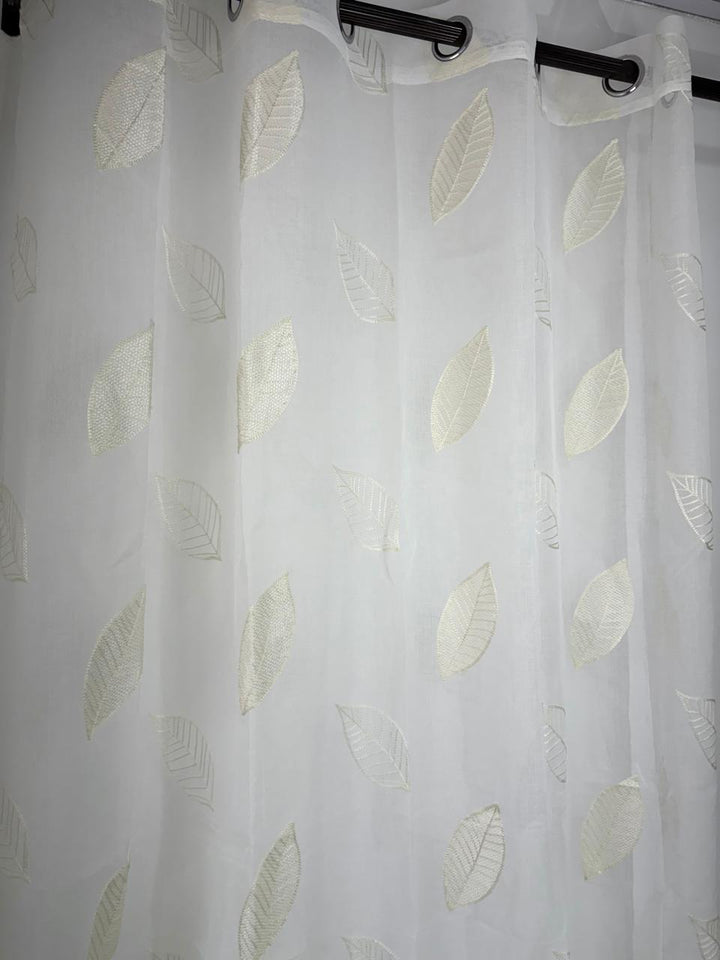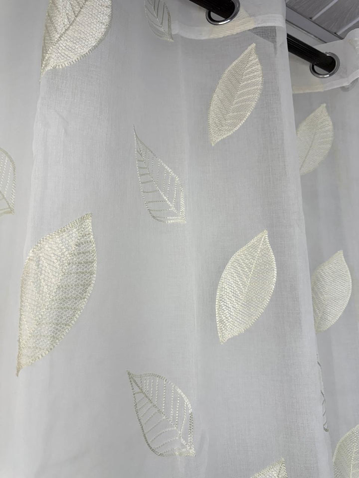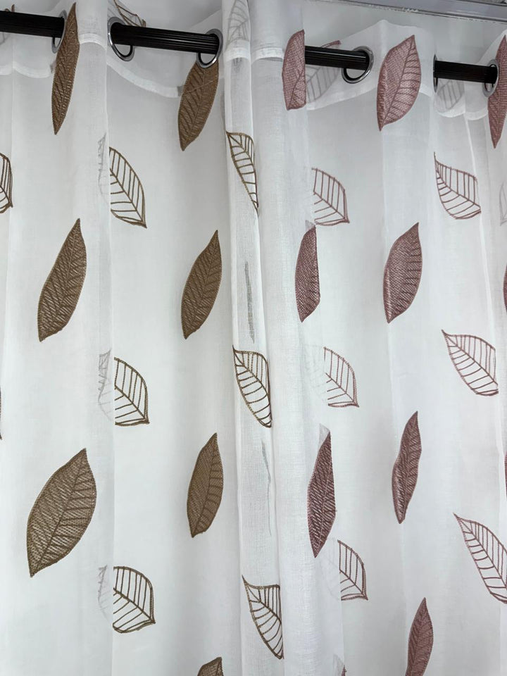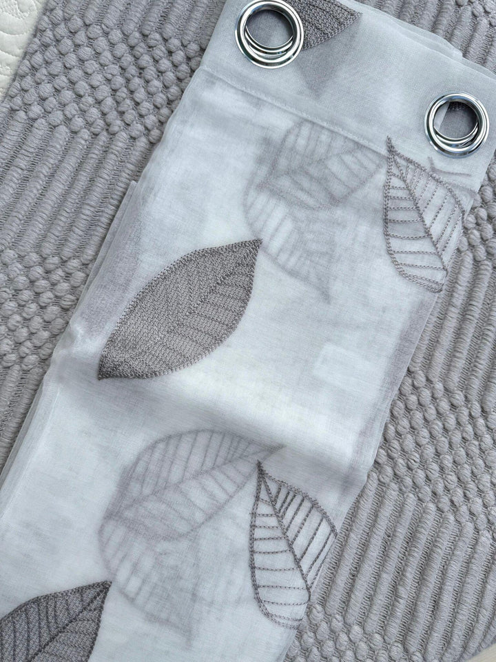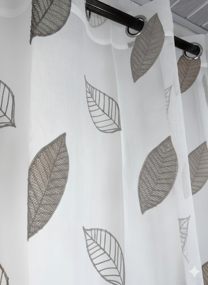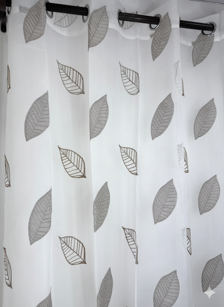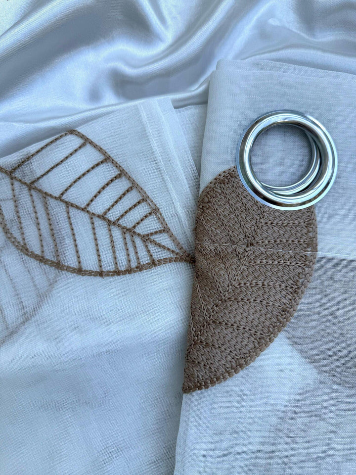 Velo decorativo con aros metálicos y textura liviana, con bordado en hojas