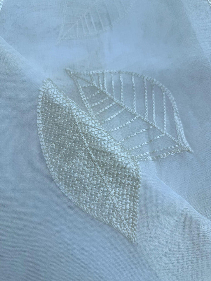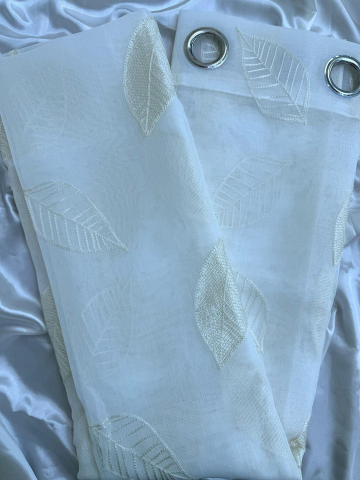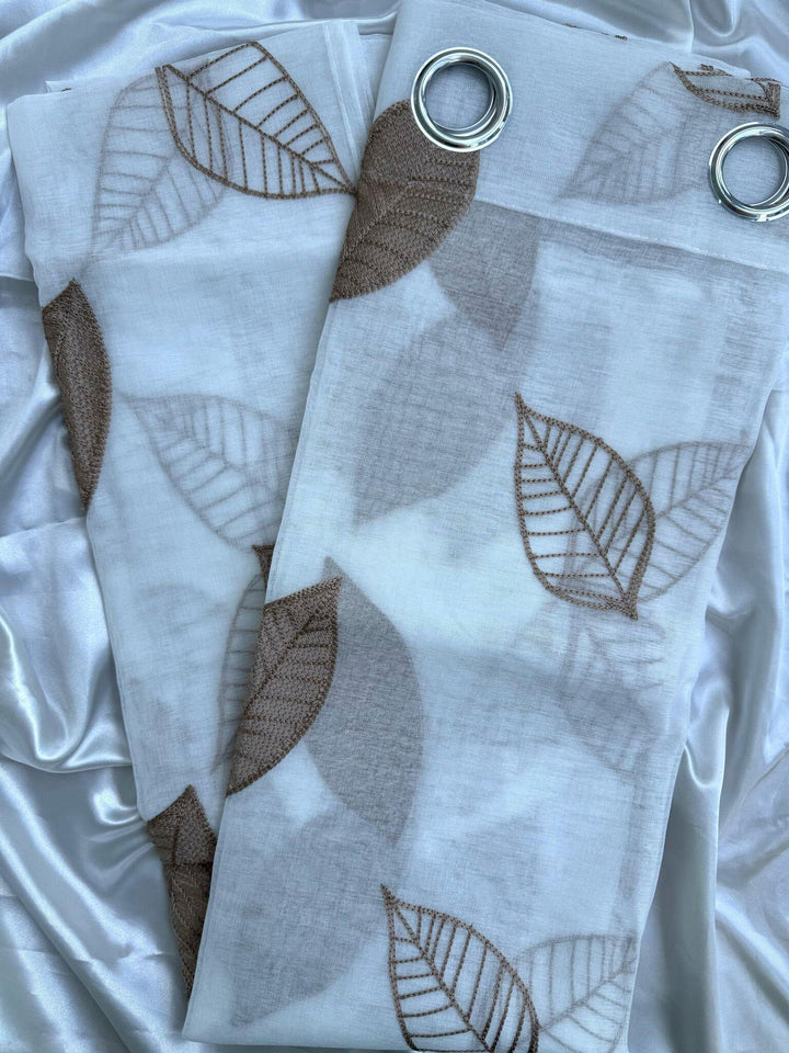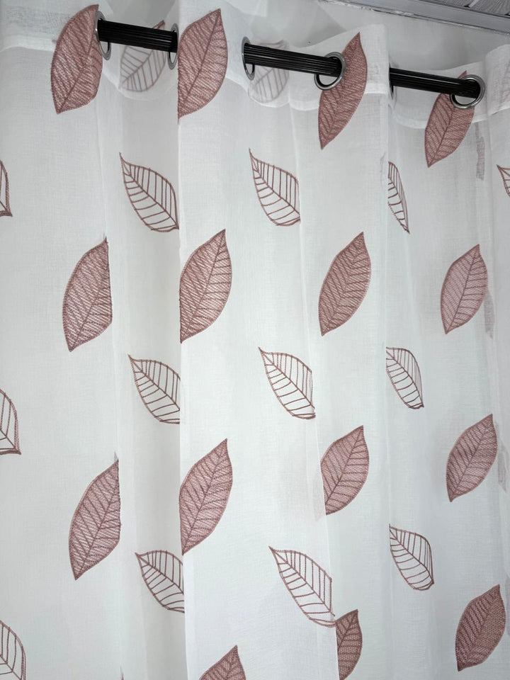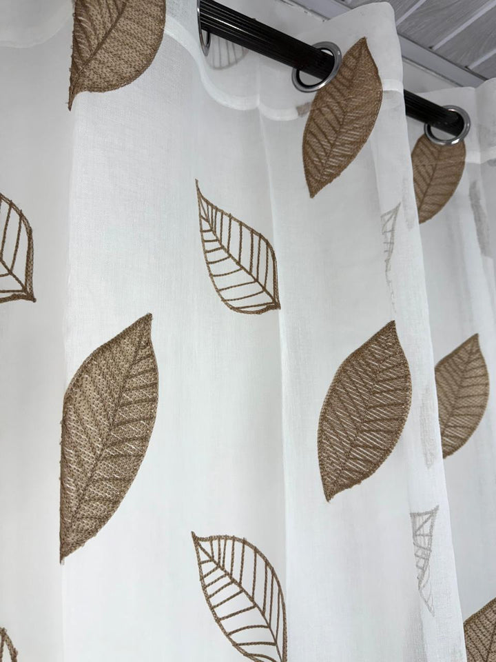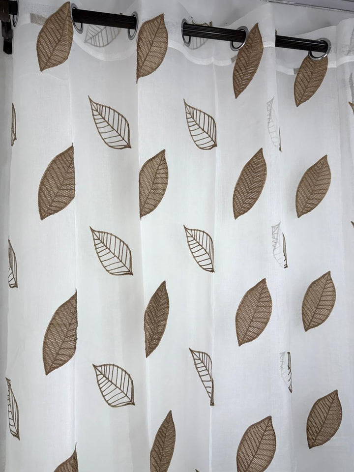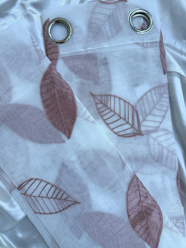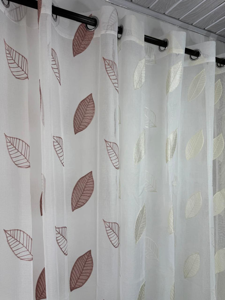 Velo decorativo con aros metálicos y textura liviana, con bordado en hojas