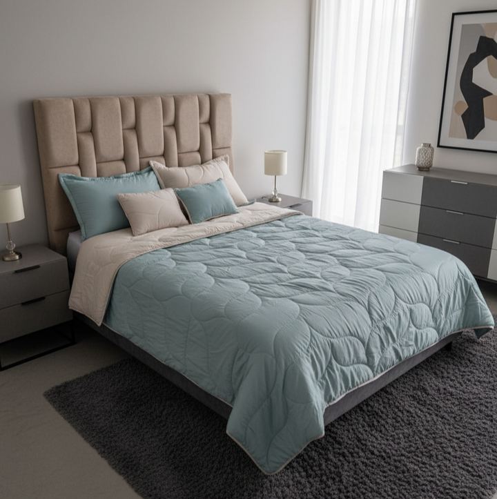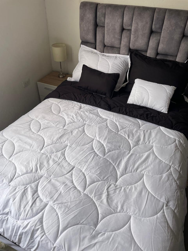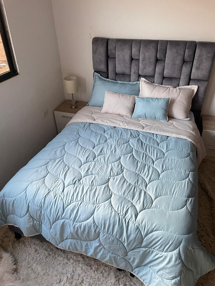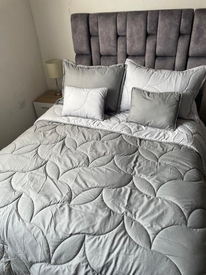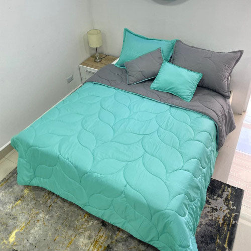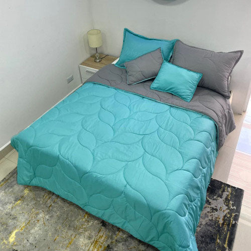 •Contiene: acolchado doble faz tipo plumón, dos fundas para almohada y dos cojines decorativos
