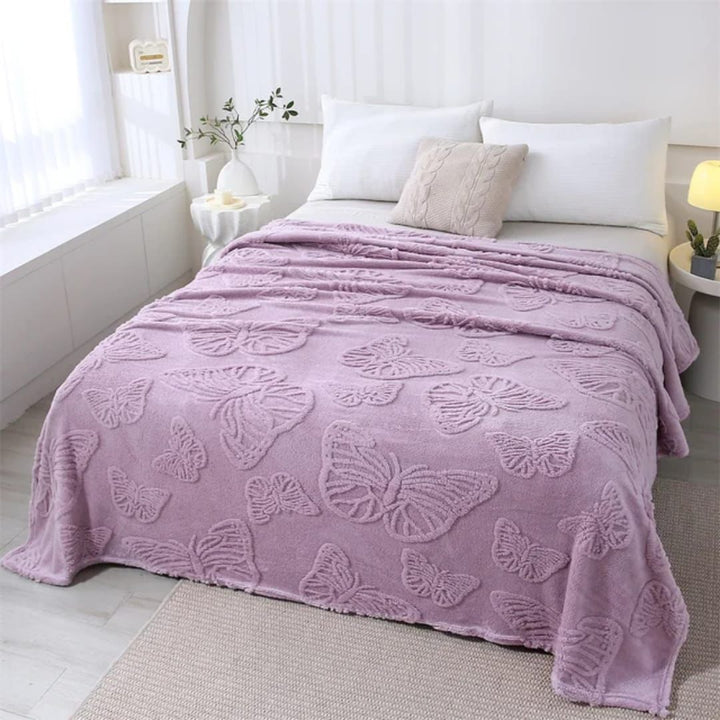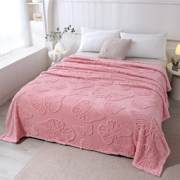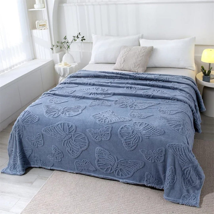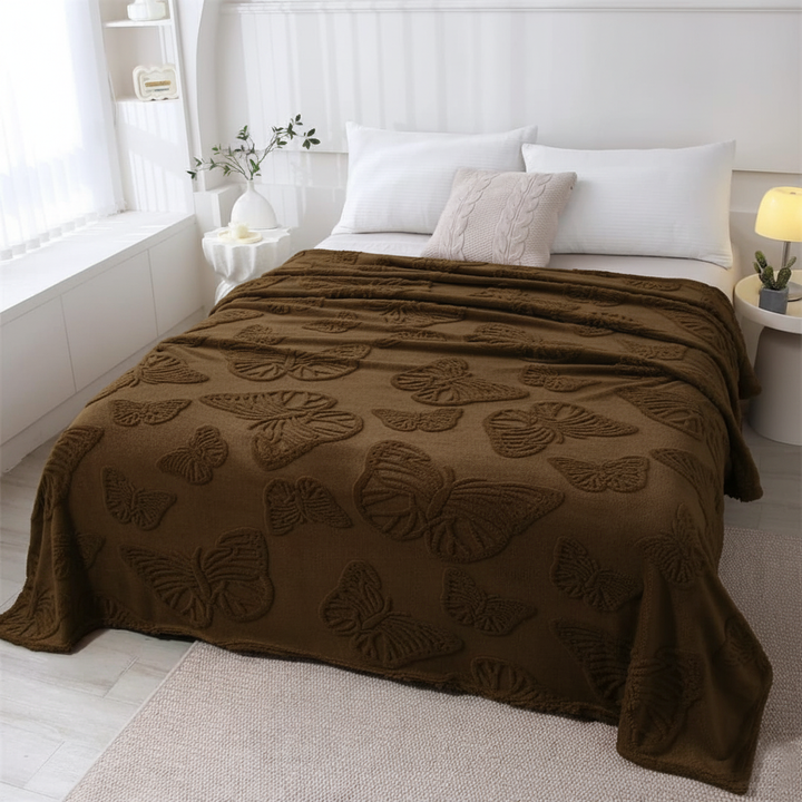 Cobija suave con textura en alto relieve y reverso tipo ovejero, ideal para brindar abrigo y confort durante el descanso.