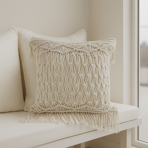 Funda de cojin tejida tipo croché con bolero en las esquinas
