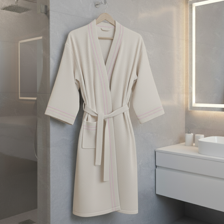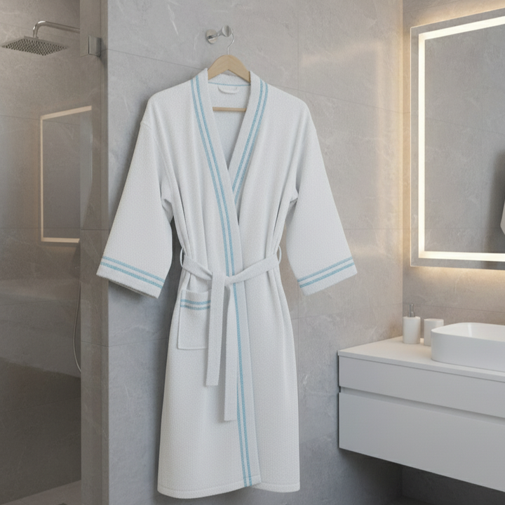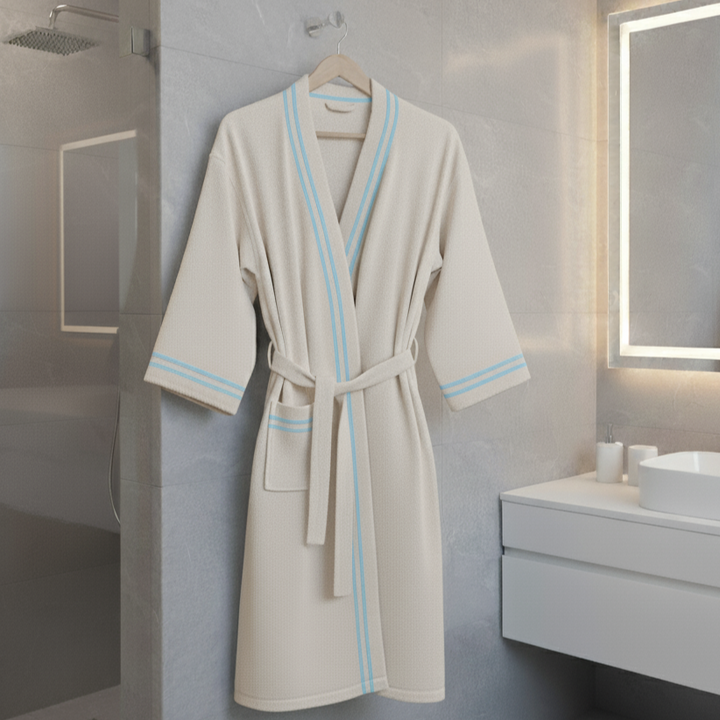 Bata tipo toalla elaborada en tela absorbente, ideal para secarse después del baño, mantener el cuerpo abrigado y absorber la humedad de forma eficiente.